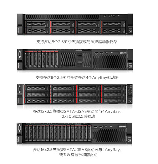 多达 16 个 2.5 英寸硬盘或 12 个 3.5 英寸热插拔硬盘或多达 8 个 3.5 英寸易插拔硬盘;