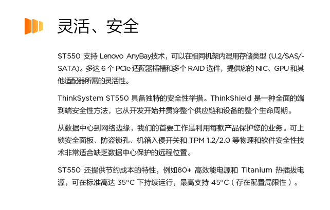 Lenovo ThinkShield、可上锁安全面板、防盗锁孔、机箱入侵开关、TPM 1.2/2.0、预测性故障分析、热插拔/冗余驱动器、冗余电源